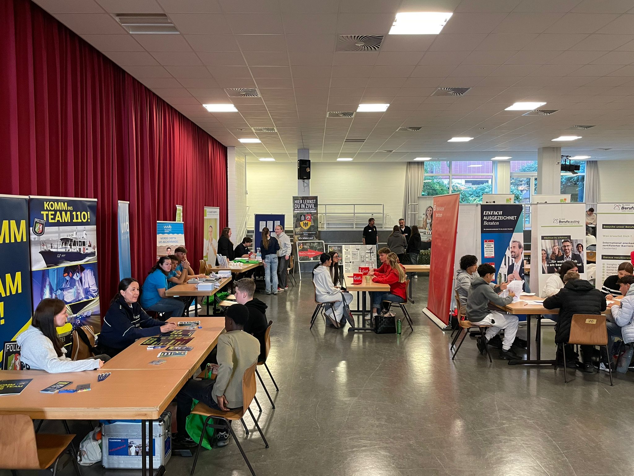 In diesem Jahr konnten wir uns über die Teilnahme von sieben neuen Unternehmen freuen. Dazu gehören: Vulkan, Wasserwelten Bochum, Sparkasse Bochum, USB, Berufscasting, der zivile Bereich der Bundeswehr, sowie das Bistum Essen, die Informationen zum Bundesfreiwilligendienst gaben.Bereits in den Vorjahren und auch in diesem Jahr wieder vertreten war die Polizei Bochum, die St. Elisabeth Gruppe, Katholisches Klinikum Bochum, Knappschaft Bahn – See, Mein Lachen sowie Frau Himmelskamp von der Agentur für Arbeit.Die Schüler des 10. Jahrgangs hatten die Möglichkeit potentielle Arbeitgeber für eine Ausbildung und die vielfältigen und teils überraschenden Ausbildungsberufe, die die verschiedenen Unternehmen bieten, kennenzulernen. Einige Schülerinnen und Schüler erschienen gut vorbereitet mit Lebensläufen, die sie direkt bei den Unternehmen abgaben.Unsere Schüler des 9. Jahrgangs knüpften Kontakte für das, im Frühjahr bevorstehende, Praktikum.Dass die Ausrichtung einer schulinternen Messe wichtig und richtig ist, zeigen die 19 Schülerinnen und Schüler aus dem letzten Jahrgang 10, die in diesem Sommer eine Ausbildung – teils bei den genannten Unternehmen, begonnen haben. Sie ist somit ein wichtiger Bestandteil der beruflichen Orientierung an unserer Schule.Daher gilt unser Dank allen Messeteilnehmern, die in diesem – und auch in den letzen Jahren – dabei waren und freuen uns darauf, Sie und neue interessierte Unternehmen, im kommenden Schuljahr in unserem neuen Gebäude Willkommen zu heißen.
